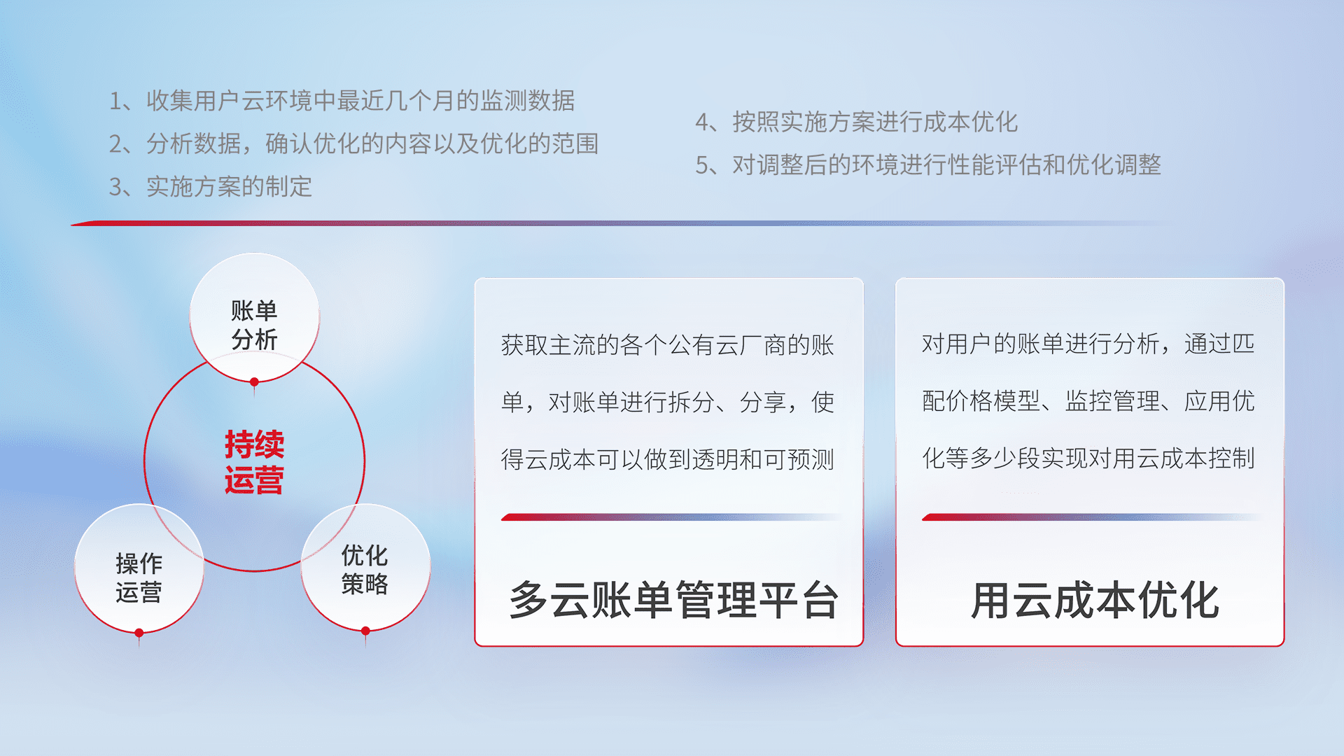 通过多云纳管,,,,以统一的资源数据模型把客户的云资源进行抽象和封装,,进而实现对多云资源的统一操作,,,,保障云资源管理的可靠性、、稳定性与可用性。。。。量身定制化运维内容,,配置、、、开发运维、、补丁管理、、备份、、监控、、认证和访问管理、、、审计和日常巡检等,,保障在用云过程中的可靠度,,稳定度以及高可用率。。。